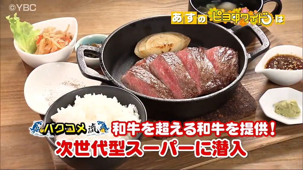 「バクコメ流」は、お笑いコンビのバクコメがこだわりの和牛を扱っている山形市のスーパーマーケットへ。店頭には自社牧場直送の鮮度と赤身が自慢の牛肉が並んでいた。店内には鉄板焼きコーナーがあり、バクコメが選んだステーキ用の牛肉を調理してもらう。