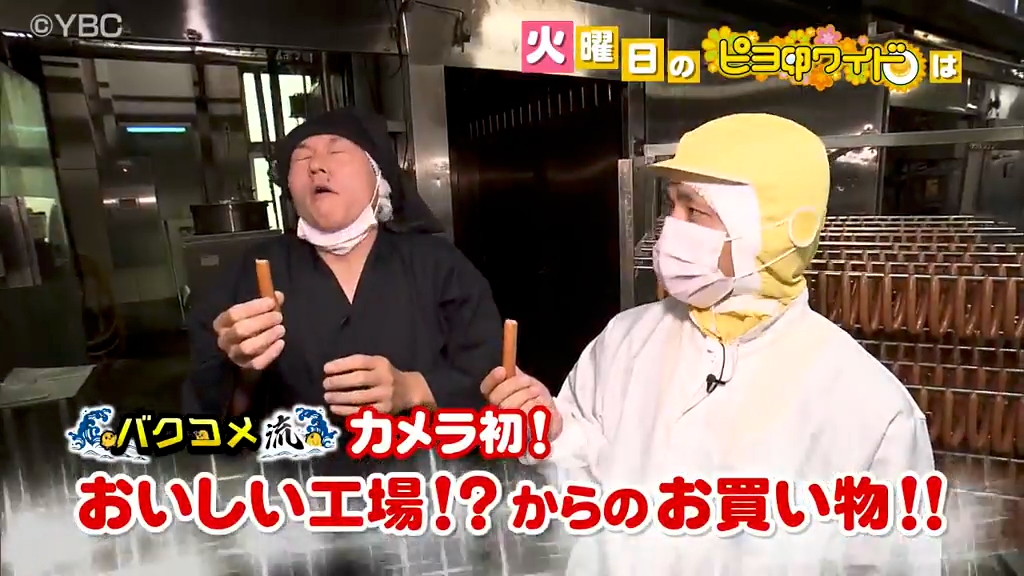 業務用のウィンナーやベーコンなどの製造販売を行う寒河江市の企業にお笑いコンビ・バクコメが潜入!!一般のお客さんも買うことができる新設の売り場を紹介。カメラが初めて入るウィンナーの製造工場ではできたてを味わう。
