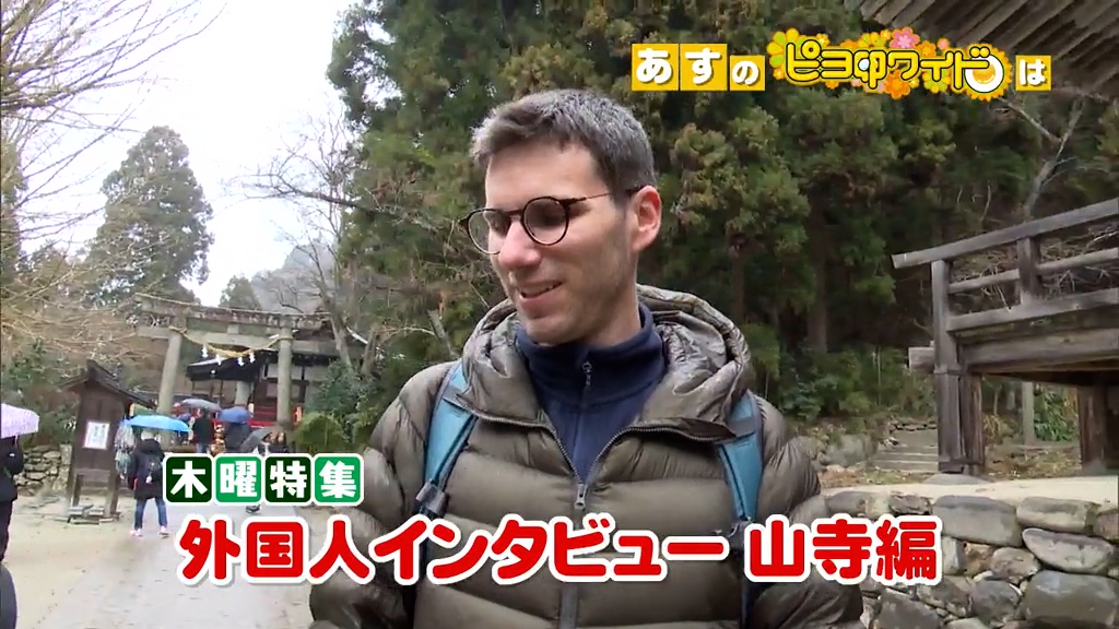 外国人観光客のインタビュー企画第3弾!今回は山形市を代表的する観光地・山寺へ。アメリカ、スペイン、イギリス、シンガポールなど様々な国から訪れた観光客に山寺へ来た目的のほか、名物の「玉こん」を食べた感想などを聞いた。