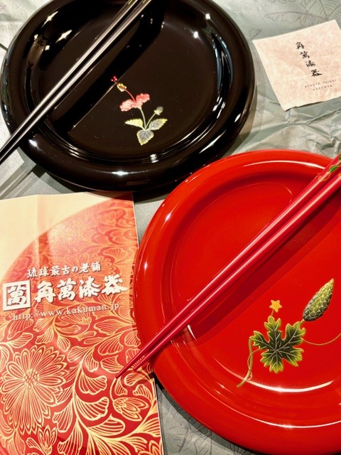 約600年の歴史と伝統がある「琉球漆器」 初めて手にしました。 中国から伝来した漆器の技法を取り入れて、 沖縄独自の琉球漆器へ発展したそうです。 うちなんちゅのウッシー夫妻からいただきました。 ありがとう!!嬉しい!! とてもとても美しく、 絵柄がハイビスカスとゴーヤ! 可愛い! 漆器好きの私にとって、最高に嬉しい贈り物。