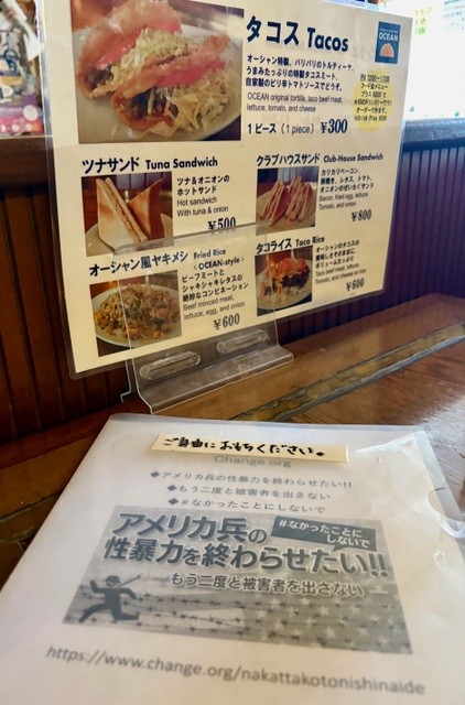 コザ。米軍が越来村の胡屋地区をKOZAと呼んだことがきっかけで、 一般の人々も「コザ」と呼ぶようになったんだとか。 以前来た時にも感じましたが、 飲食店などがたくさん集まっているエリアは完全にアメリカです。 ちょっと怖さを感じます。 だいぶ前の話になりますが、米軍基地の取材で訪れた時に、 取材の許可をいただきたく、あるお店に「私だけ」入店したら、 「1人で来たのか?」と日本人の店主に怖い顔で聞かれ、 「なんで女1人で来たんだ!今すぐ帰れ!」と叱られました。 私は沖縄の現実を全く知らないまま取材に来ていたのです。 この時初めて、沖縄県と米軍の関係について、 沖縄の人たちの思い、戦時中、戦後の沖縄について知りました。 自分が情けなく申し訳ない気持ちにもなったことを今でも忘れられません。 写真は、マスターのお店のメニューと一緒に置いてあったチラシです。 お店のトイレの壁にもこれらに関するメッセージや 講演会・イベントのポスターが飾られていました。