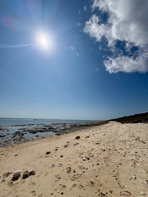 「久高島」 自然の海浜植生が見られ、 五穀の種子が入った壺が漂着したという五穀発祥伝説の浜、 「イシキ浜」 長く続く浜辺。 海の音だけが聞こえる中で深呼吸。 もう最高に癒されます。 私はいつもここで生まれ変わっています。たぶん。笑。 海水も優しく、毎回お天気が良くて。生きる力をもらえる場所。 今回もあたたかい光を受けることができました。