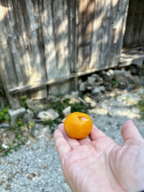 これは何でしょう? 「シークヮーサー」です。 久高島をガイドしていただきながら、 大きな木があって、たくさん実がなっていました。 西銘さんが食べてみて!というのでいただきましたが、 思ったよりも優しい味で、めちゃくちゃ美味しい!! 陽射しが強い中にピッタリなんですね。 神様、沖縄、ありがとう。