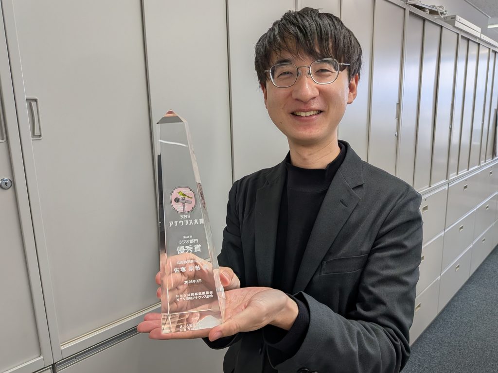 YBCの佐塚崇恭アナウンサーが、日本テレビ系列31局が加盟するNNS(Nippon Television Network System)の2025年 第47回アナウンス大賞ラジオ部門優秀賞を受賞しました。 審査員からは、『柔らかい口調とトーンで優しく伝え続ける力がある。状況を忠実に言語化する描写力の高さを感じさせる。』などと高い評価を得ました。 この賞は、2025年1月~12月までに放送された番組で、アナウンス技術の向上など、ネットワークのイメージアップに貢献した 日本テレビ系列各社のアナウンサーを表彰するものです。