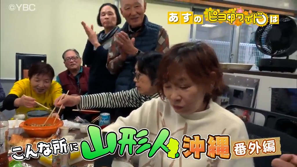 金のピヨ卵「こんな所に山形人」の沖縄番外編2回目。アナウンサーの山川と中田が沖縄在住山形県人会の皆さんに「芋煮」と「青菜漬」を振る舞った。また、那覇市内で食堂を営む南陽市出身の男性の故郷への思いを実家の両親に届けた。
